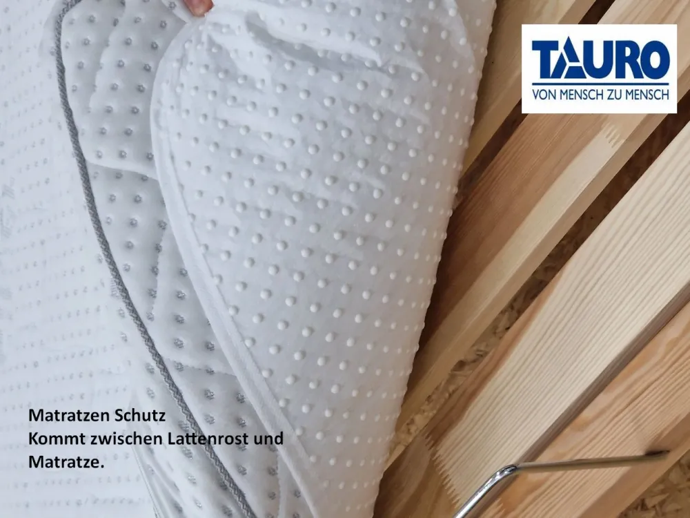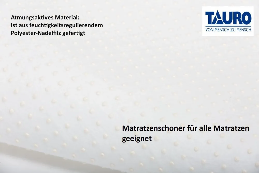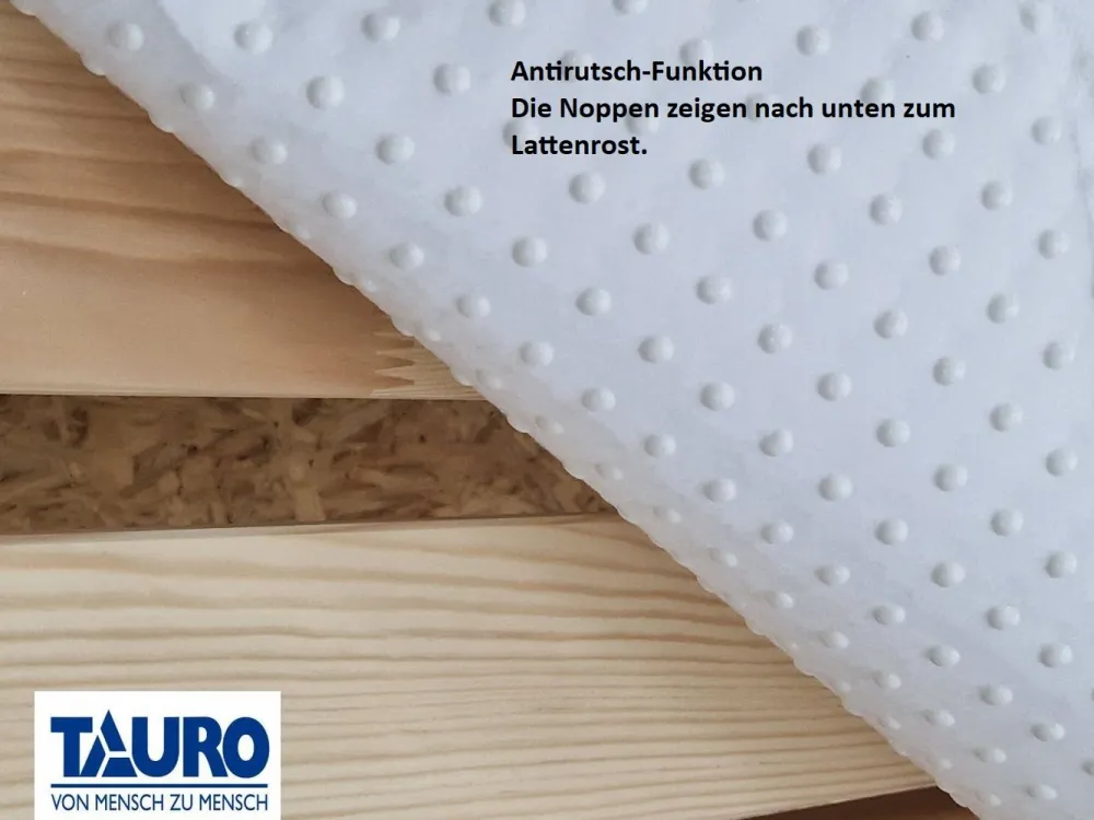 Der TAURO Noppen Matratzenschoner dient dem Schutz der Matratze und wird auf den Lattenrost, unter die Matratze gelegt. Aufgabe des Noppen Matratzenschoners ist es, die Matratze im täglichen Gebrauch vor Schmutz und Nässe zu schützen. Da die meisten Schlafzimmerfußböden kalt sind und sich somit von unten her Luftfeuchtigkeit auf der Matratze niederschlagen kann, wird der schützende Schoner verwendet. Ein weiterer Schutz besteht gegen mechanische Beschädigungen durch nicht beschichtete Holzlattenroste. Hier könnten unter Belastung, raue Stellen an den Federholzleisten, den Matratzenbezug beschädigen und es werden Fäden gezogen. Der TAURO Matratzenschoner hat einseitig Noppen, die ein Verrutschen des Schoners auf dem Lattenrost unterbinden. Die Seite mit den Noppen zeigt nach unten zum Lattenrost. Die TAURO Noppen Matratzenschoner werden aus atmungsaktiven, feuchtigkeitsregulierendem Polyester-Nadelfilz gefertigt. Das Material ist gemäß des strengen ÖKO-TEX Standard 100 schadstofffrei und löst keine bekannte Allergie aus